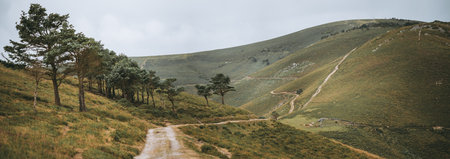 Panoramic telephoto view of winding trail through rolling green hills and sparse pine trees in Asturias, Spain, along the Camino de Santiago, under overcast sky and soft mountain light