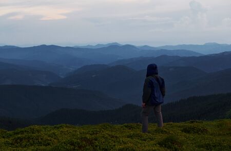 Man stands on the hill and looks far away. Majestic Carpathian mountains. Beautiful landscape. Breathtaking view.