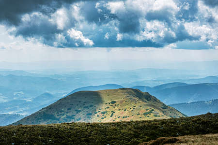 Summer panoramic landscapes of Popivan (Pip Ivan) mountain peak. Travel outdoor concept view of dramatic sky. Carpathians, Marmaroshchyna, Maramures, Ukraine