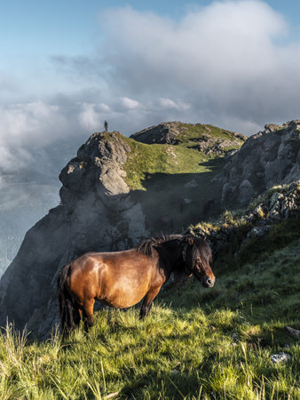 A brown horse grazing on the mountain Penas de Aya in Oiartzun, Gipuzkoa, Spain