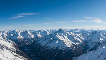 An awe-inspiring aerial view showcases snow-covered peaks against a brilliant blue sky, capturing the purity and serenity of a remote mountain landscape.