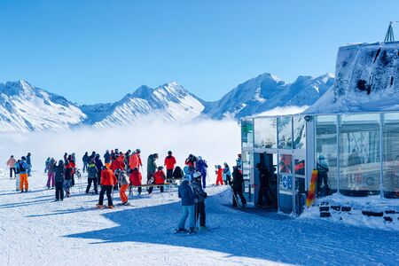 Skiers and chairlift in Alpine ski resort in Solden in Otztal Alps, Tirol, Austria