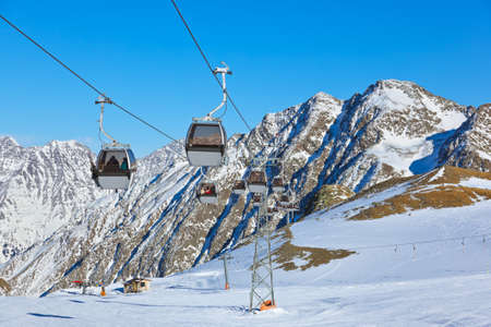 Ski lifts in the Alp mountains, Tirol, Austria. Bright blue sky and mountain covered with snow.