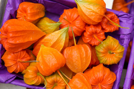 Bright orange dry boxes of physalis plants, similar to lanterns grow in the autumn on the street