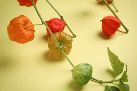Physalis branches with colorful sepals on yellow background, closeup