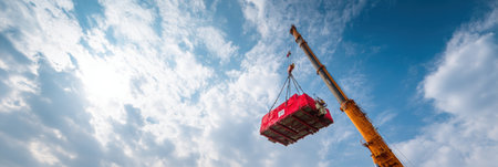 A large yellow crane is lifting a bright red container high above a construction site with a backdrop of blue sky and scattered clouds in daylight.