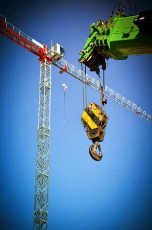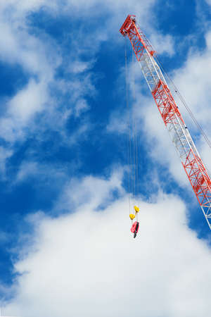 Hoisting machine industrial crane equipment against blue sky at construction site.