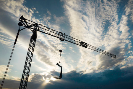 Modern construction crane extending high into the sky, with clouds and blue hues creating a sense of infinite possibility