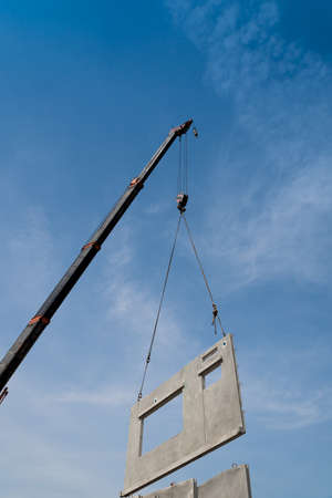 Construction site crane is lifting a precast concrete wall panel to installation building.