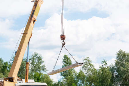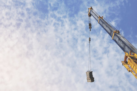 A close-up view of an industrial crane hook suspended in the air against a backdrop of cloudy skies, emphasizing construction activities and machinery operations.