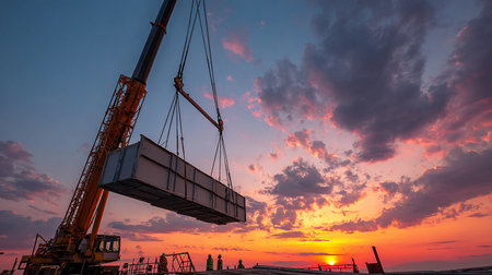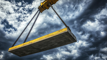 A powerful crane suspended a massive concrete slab against a dramatic cloudy sky, showcasing industrial strength and the dynamic nature of modern construction sites.