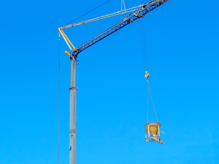 Yellow heavy duty industrial tower construction crane against blue sky with copy space
