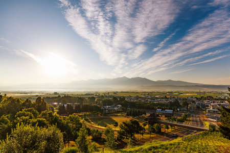 Local Japanese farm village in morning near Magome juku preserved town, Kiso valley, Nakatsugawa, Gifu, Japan. Houses and farmland against sunrise light.
