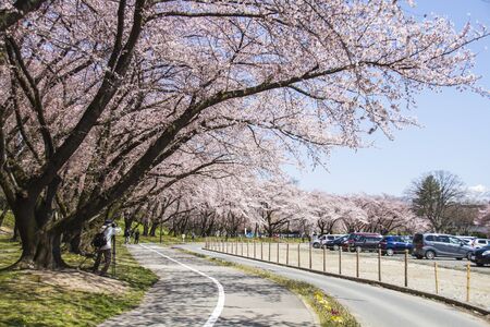 Cherry blossom at riverbank park of Shiroishi River in Miyagi, Japan. Hanami (cherry blossom) is a cultural symbol of Japan, one of the events to attract tourists.