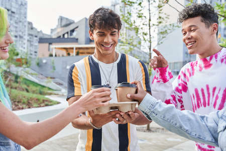 cheerful multiethnic friends in trendy clothes having fun and looking at camera outdoors