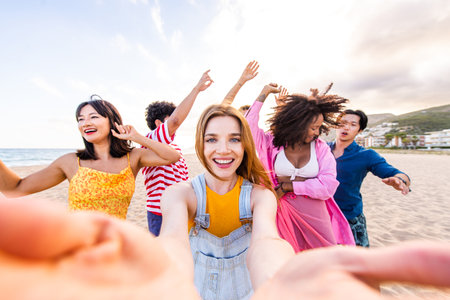 Multiracial people taking selfie outdoors - Happy life style concept with young smiling friends having fun together.