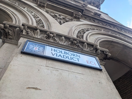 Low angle view of the historic Holborn Viaduct street sign on an ornate Victorian stone facade
