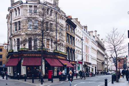 London, UK - March 06, 2020: Facade of The Blue Posts pub in Soho, an area of London famous for LGBTQ+ bars, restaurants and clubs, people standing outside and walking past, motion blur.