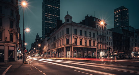 Dynamic nightfall city scene with long exposure traffic lights and urban glow,, rush hour commuting time, sunset, blurry cityscape, bokeh effect, AI generated