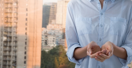 Digital composite of Businesswoman with hands palm open in city