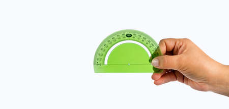 protractor and triangle tool in hand of math man teacher, education at school