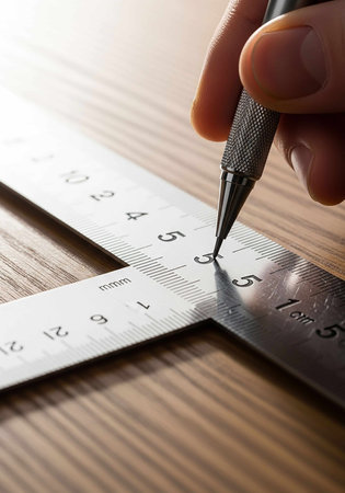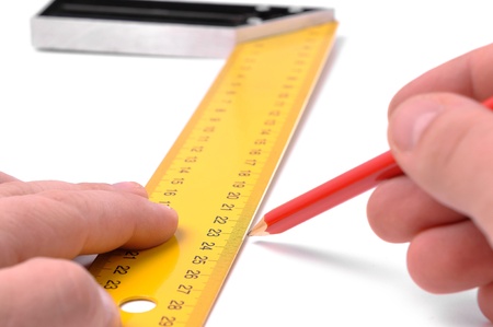 male hands holds pencil and metal angle with measure