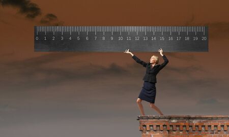 Young businesswoman measuring something with big ruler