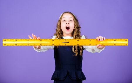 Pupil cute girl with big ruler. Geometry school subject. Education and school concept. Smart and clever concept. Sizing and measuring. School student study geometry. Kid school uniform hold ruler