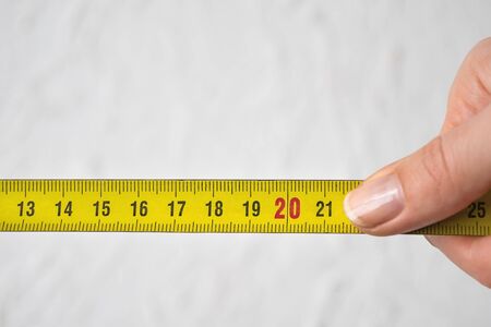 The process length measurement using a measuring tape on the background of a white wall