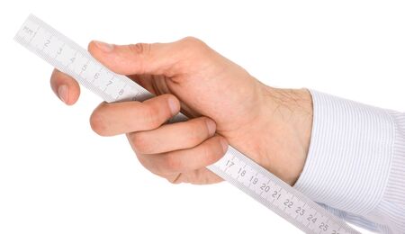Hand holding a ruler on white background