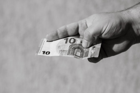 Hand of woman is giving euro money to a young man