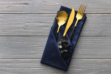 Elegant cutlery set on gray wooden background