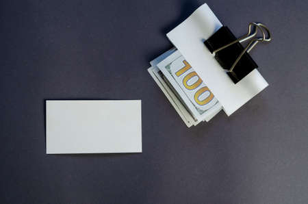 One Hundred Dollar Bills, Blank Business Card and Binder Clip on Gray Background. Top view, flat lay.