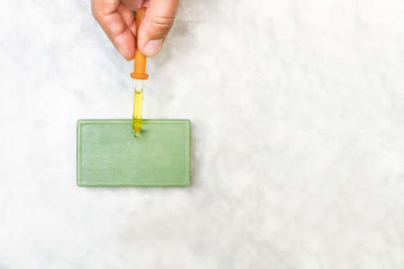 Woman hand holding a dropper with skin oil on a green soap bar on a marble table in a top view