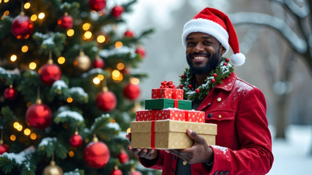Hands holding a lot of large Christmas gift boxes on a red background near a tree. High quality photo