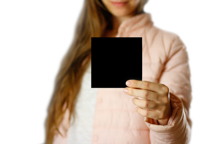 A woman in a warm winter jacket holding a black leaflet. Blank paper. Close up. Isolated on white background.