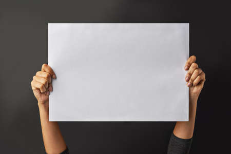 Hands holding blank paper on black background. Mockup for design.
