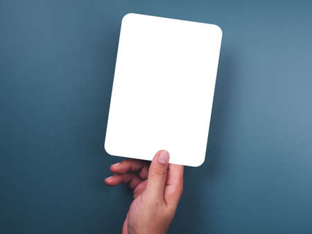 Mockup paper holding with the right hand. Hand holds the white blank mock-up white paper with a rounded corner and a vertical style on a blue background.