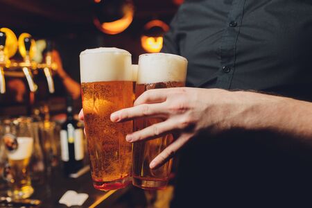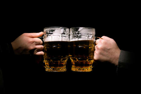 Two glasses of beer in the pub. Close-up of two hands with glasses of beer.