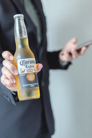 Close-up of hands of Japanese man holding beer