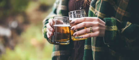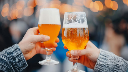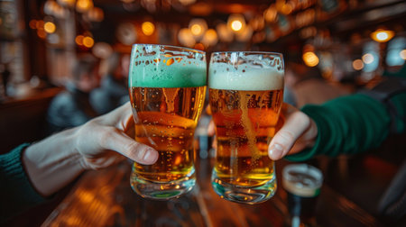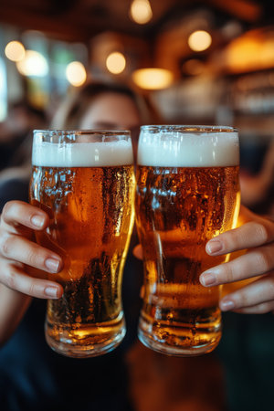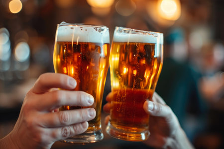 Two individuals clink frosty glasses of amber beer, their hands prominently featured in the foreground. The warm, dim lighting creates a cozy atmosphere, while the background blurs into a soft bokeh, suggesting a lively pub setting. The scene exudes camaraderie and celebration, capturing the essence of a joyful social gathering.