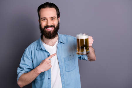 Portrait of positive cheerful guy hold glass beer point index finger demonstrate excellent drink alcohol wear casual style clothes isolated over grey color background
