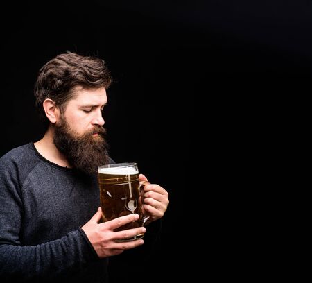 Stylish man with beard holds mug of beer. Bearded man drinking beer from glass at bar or pub. Drinks, alcohol, leisure and people concept. Bad habits. Bearded drunk hipster male holds craft beer