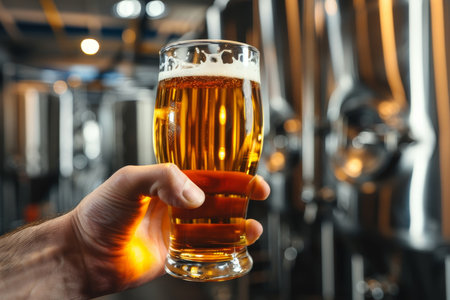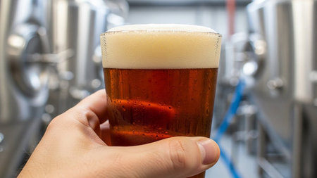 A close-up of a hand holding a glass of amber ale with a thick foamy head, blurred brewery tanks in the background.
