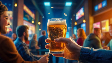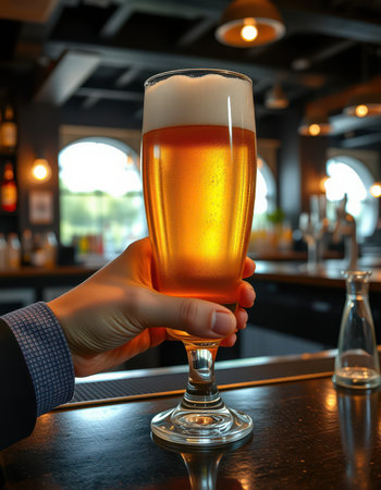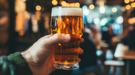 A person is holding a glass of beer in a bar. The atmosphere is casual and relaxed, with people sitting and enjoying their drinks