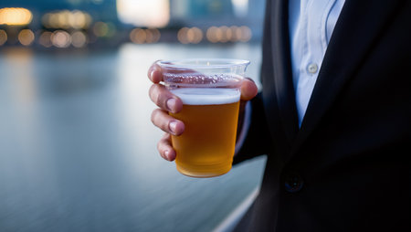 Fresh beer drops wet hand, young men celebrate city nightlife generated by artificial intelligence