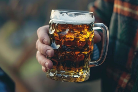 A hand holding a frosty mug of beer, perfect for celebrating Oktoberfest or any casual social gathering
