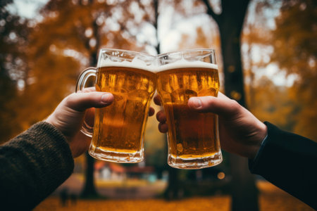 Hands of people clinking glasses with beer at Oktoberfest festival