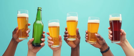 Multiple hands holding various types of beer glasses and bottles against a turquoise background, symbolizing celebration and friendship. The image highlights social gatherings and beverage enjoyment.