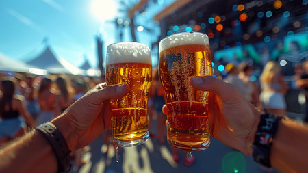Two hands raise glasses filled with golden craft beer towards each other, celebrating in a lively outdoor setting adorned with warm bokeh lights as twilight approaches.